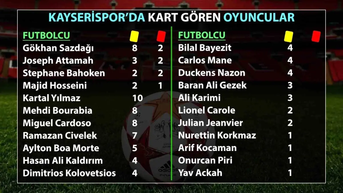 Süper Lig gruplarından Kayserispor, 2024-2025 döneminde 90 sarı kart, 7 kırmızı kart gördü. Sarı-kırmızılı kadroda en çok kart gören isim ise kaptan Gökhan Sazdağı oldu. Gökhan Sazdağı 8 sarı kart, 2 kırmızı kart ile cezalandırıldı.